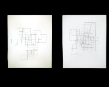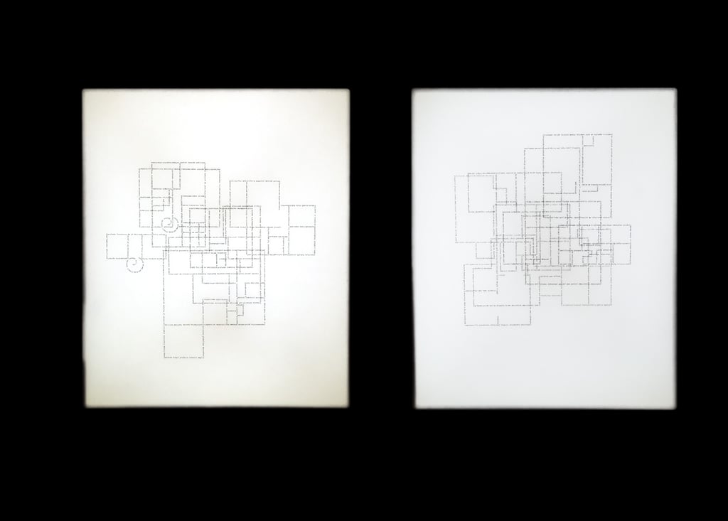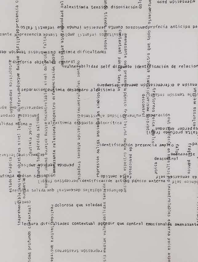 Construyo las paredes de mis casas con palabras que conforman líneas. Las palabras vienen de un antiguo psicodiagnóstico, documento que define un estado de salud mental, personalidad y conflictos. Saco sus palabras de contexto para usarlas como medio de creación artística y poética.