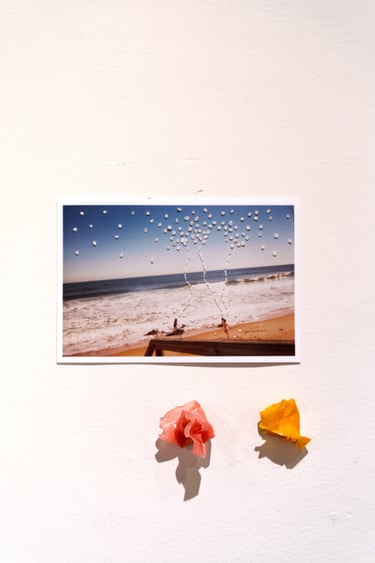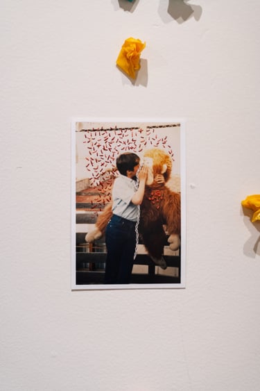Esta es una obra colaborativa hecho junto al artista Abel Vasquez (esculturas de resina). De naturaleza instalativa, su disposición puede cambiar de acuerdo al espacio que habita. Intervengo fotos del álbum familiar, inclinándome hacia aquellas fotos de infancia, propias y ajenas.