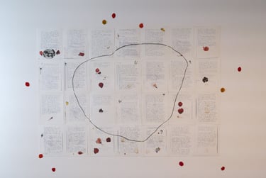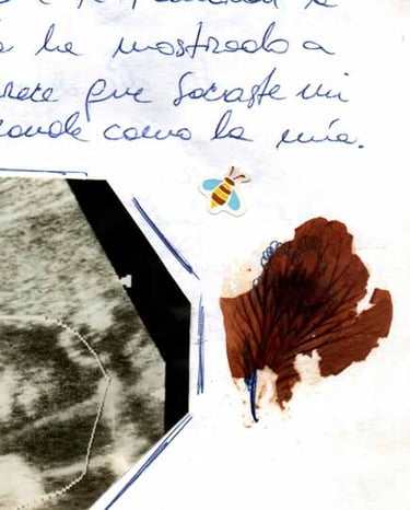Llego al primer habitar, mi primer cobijo, que se refleja en un objeto de memoria: el diario. En este caso se trata de un diario de embarazo escrito por mi madre. Si bien toda la experiencia no alcanza a resumirse en palabras, el diario es de por sí un dispositivo y objeto particular en el que hay un registro muy íntimo: ella anota sus pensamientos y emociones, mis movimientos, mi crecimiento. Además de un diario, es un archivo, pegó stickers y pétalos de buganvilia que ayudan a oxigenar lo conservado durante tantos años. Esta experiencia, la escritura y voz materna, son mi primer habitar: cartografía circular que atraviesa y unifica todas sus páginas en un solo espacio.